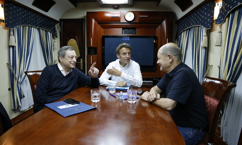Il premier italiano Mario Draghi, il presidente francese Emmanuel Macron e il cancelliere tedesco Olaf Scholz arriveranno in mattinata a Kiev per incontrare il presidente ucraino, Volodimyr Zelensky. Circola già in rete la foto dei tre capi di Stato e di governo europei su un treno che corre verso la capitale dell’Ucraina per mandare un forte segnale di sostegno al suo popolo.