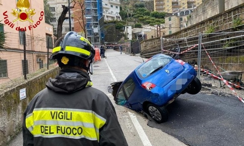 Una bomba d’acqua, la strada che cede piano piano, poi il crollo e un’auto che precipitata nella voragine. Momenti di terrore a Napoli, sulla rampa d’accesso al parco Comola Ricci al corso Vittorio Emanuele.